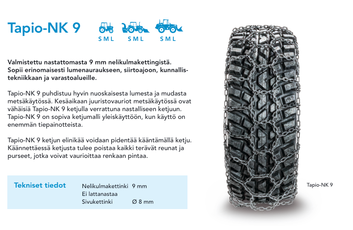 Tapio‑NK 9 isepuhastub hästi märjast lumest ja mudast ning keti eluiga saab pikendada ketti ümber pöörates.