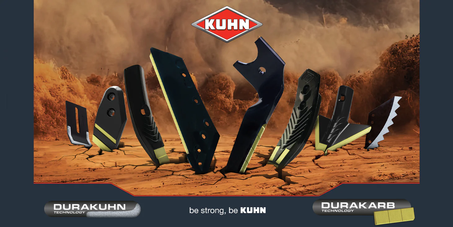 KUHN DURAKARB ja DURAKUHN karbiidkuluvosad on loodud taluma kõige abrasiivsemaid ja kivisemaid töötingimusi, pakkudes masinatele kuni 2–8× pikemat kasutusiga. Karbiidiga tugevdatud detailid säilitavad oma kuju, tagavad ühtlase mullavoo ja vähendavad hoolduskulusid.